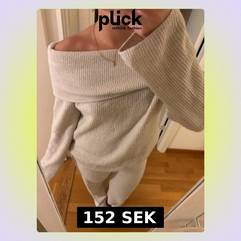 Supermysig beige stickad tröja från H&M i storlek S 💕Säljer eftersom att den inte kommer till användning. Tröjan har en bred offshoulder-krage och ribbad struktur som ger en chill vibe. Perfekt för att hänga hemma eller när du vill vara extra comfy!