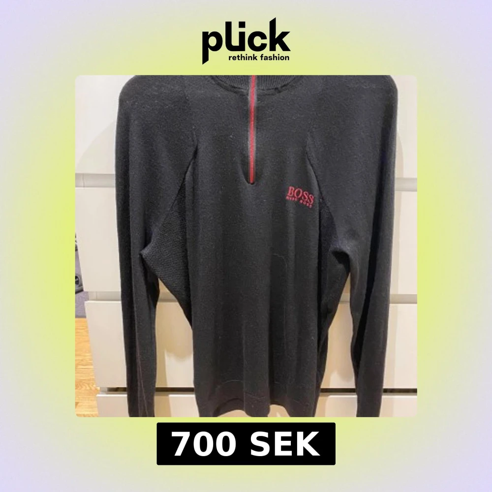 Svart stickad tröja från Hugo Boss med röd logga på bröstet och ryggen. Tröjan har hög krage och en snygg röd half zip-dragkedja framtill. Långärmad modell med ribbade muddar och diskreta stickade detaljer på sidorna. Perfekt för dig som gillar stilren design.