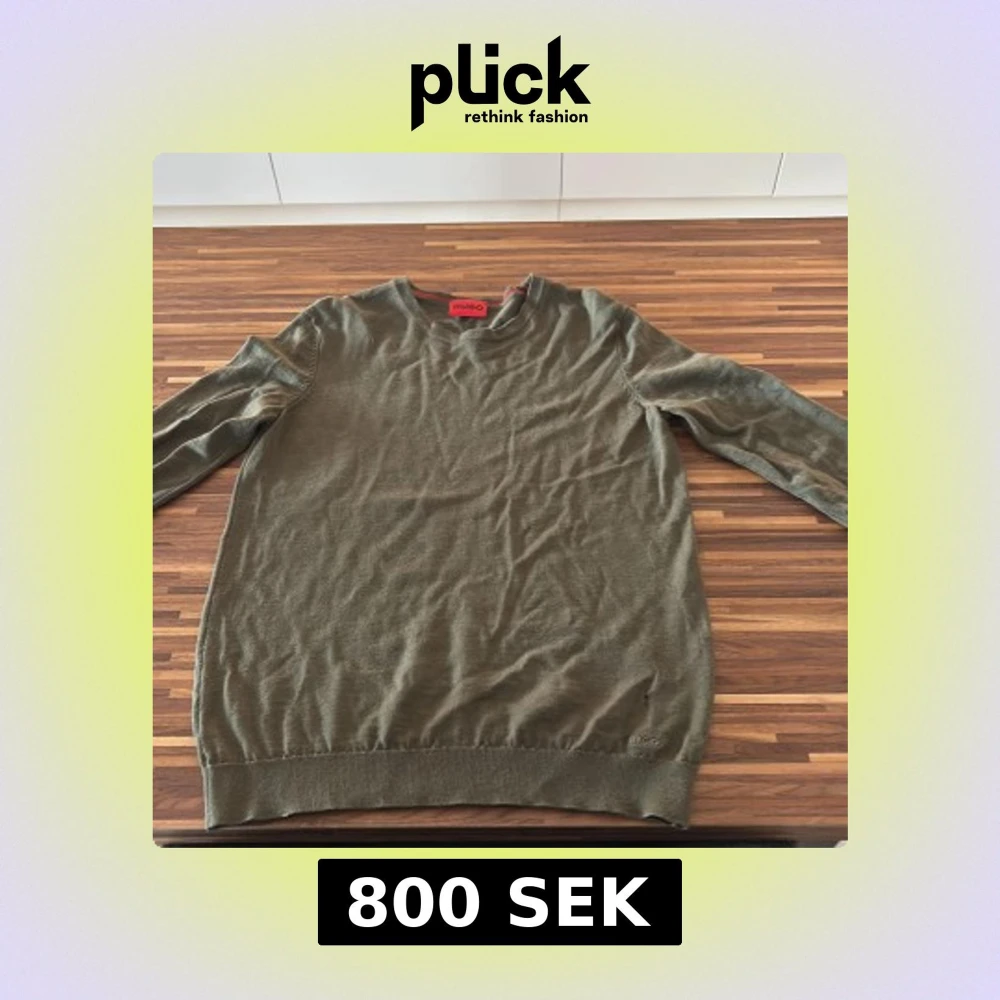 Snygg olivgrön stickad tröja från Hugo med rund halsringning och diskret broderad logga nertill. Tröjan har lång ärm och är i ett mjukt, tunt material som passar perfekt till lager-på-lager. Enkel och stilren design som funkar till många outfits. Köpt på room 1006 på Emporia för 2000kr. Den är liten i storleken så den passar även S.