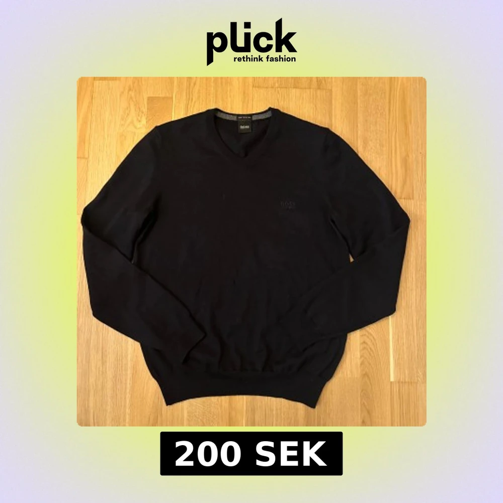 Klassisk svart stickad tröja från Hugo Boss med v-ringning och diskret logga på bröstet. Tillverkad av fin italiensk ullblandning, perfekt för lager-på-lager. Långärmad och med ribbade muddar för en snygg passform. Storlek S. Har tyvärr en reva och ett litet märke, se bild 3 och 4