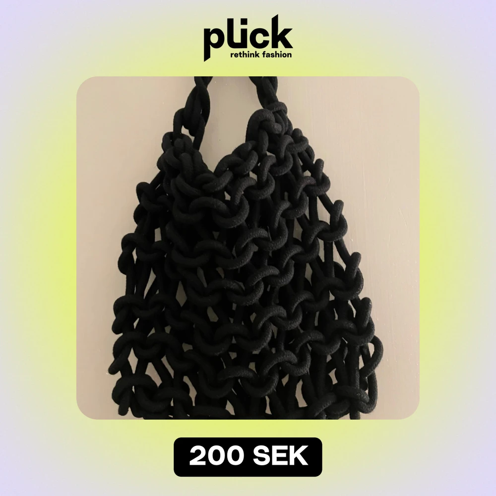 Säljer en unik svart stickad väska med ett coolt, chunky mönster. Perfekt för att ge din outfit en edgy touch. Väskan är handgjord och har en bekväm handtagslängd för att bäras över axeln. Passar perfekt för både vardag och fest!