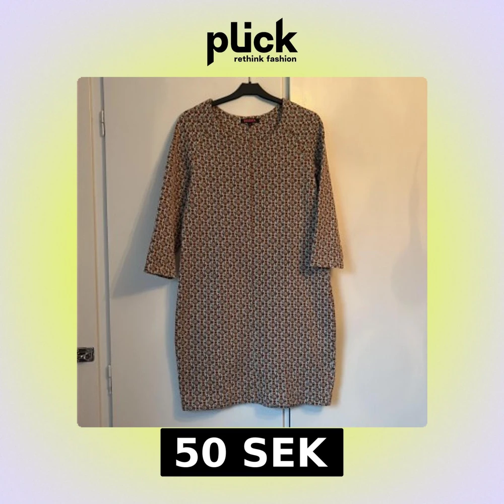 Säljer en snygg kortklänning från Indiska i storlek M. Klänningen har ett geometriskt mönster i svart, brun och beige, med trekvartsärmar och rund hals. Materialet är mjukt och stickat, vilket gör den både bekväm och stilren. Perfekt för dig som gillar retrovibbar och coola prints.