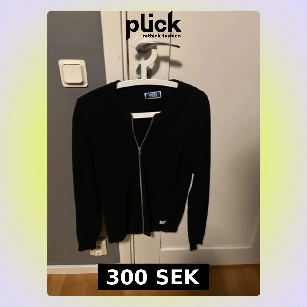 Svart kofta från Jack & Jones med stilren design och hel dragkedja framtill. Den är storlek 164 och är i mycket bra skick. Hör av dig vid minsta fundering