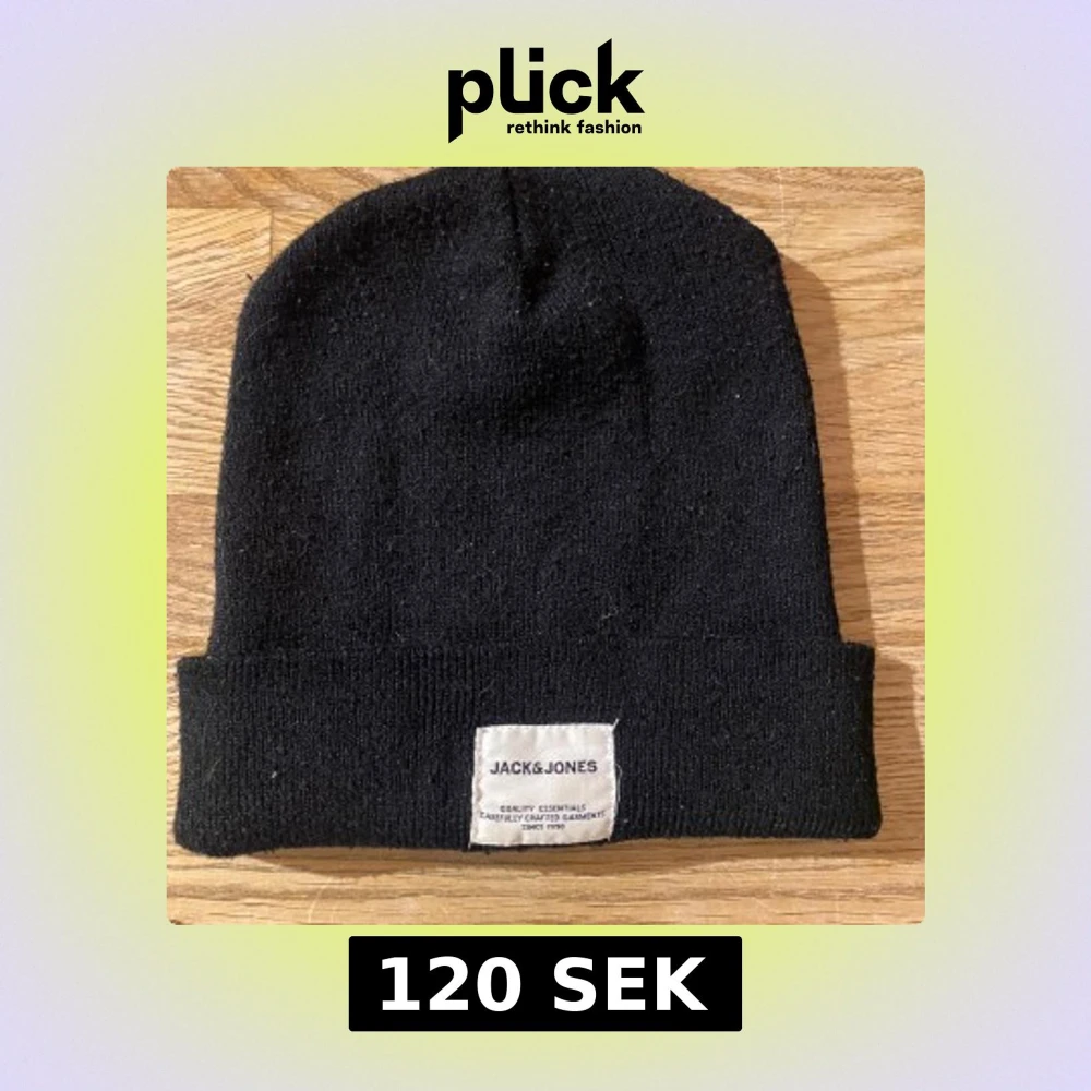Svart, klassisk stickad mössa från Jack & Jones med uppvikt kant och vit logotyp-patch framtill. Perfekt för kalla dagar och enkel att matcha med alla outfits. Knappt använd