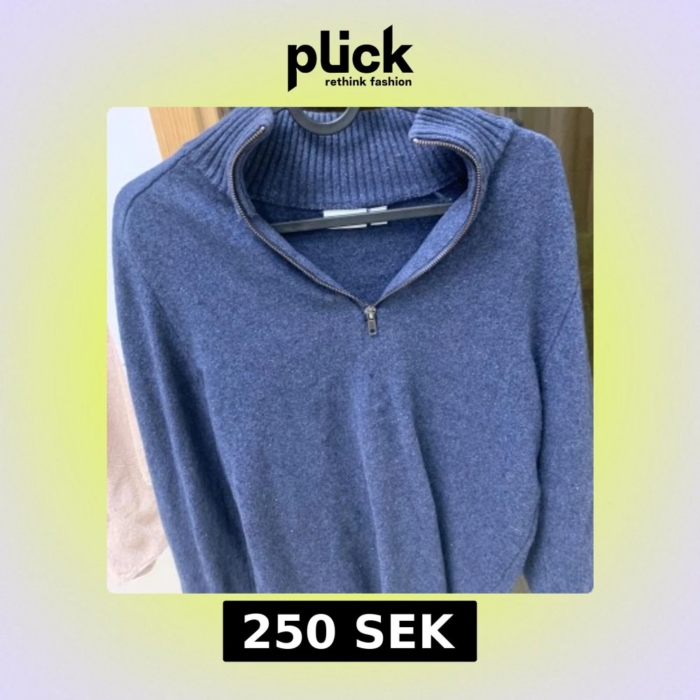 Mysig blå stickad tröja med ribbad hög krage och half zip-dragkedja. Perfekt för kyliga dagar och enkel att styla med jeans. Tröjan har lång ärm och en klassisk, avslappnad passform. Hör av er vid frågor!!!