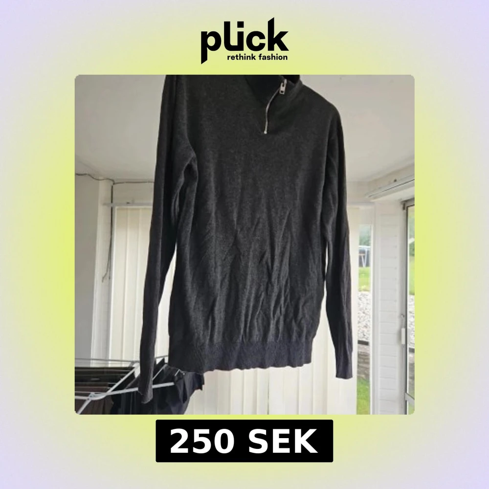 Mörkgrå stickad tröja från Jack & Jones med half zip-dragkedja i halsen. Tröjan har lång ärm, ribbade muddar och en clean, klassisk look som funkar till jeans eller chinos. Perfekt för lager-på-lager under höst och vinter. Mycket fint skick.