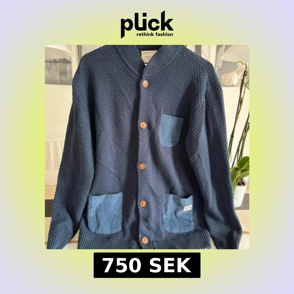 Snygg mörkblå kofta från Jack & Jones i storlek XL. Koftan har ett coolt strukturerat stickat tyg, tre blå manchesterfickor och träknappar framtill. Ribbad krage och muddar ger extra stilpoäng. Perfekt för dig som gillar detaljer och chill vibe.