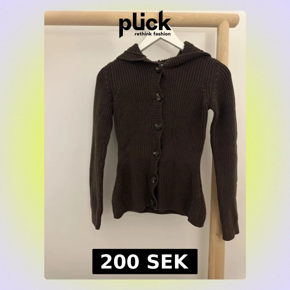 Säljer en brun stickad kofta från JC i storlek S. Koftan har långa ärmar och knäppning med stora knappar framtill. Modellen är figurnära med ribbad midja för extra passform.