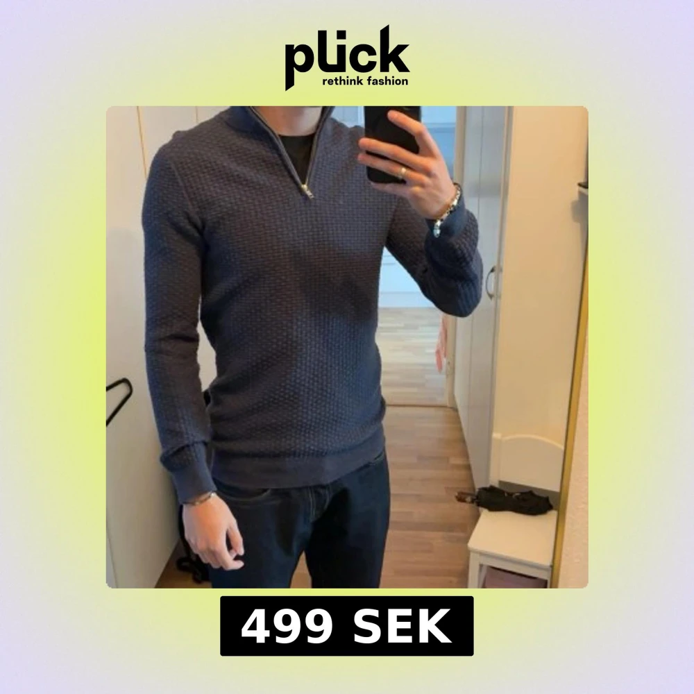 Säljer en marinblå stickad tröja från John Henric med snygg struktur och half zip-dragkedja. Tröjan har hög krage. Passformen är slim och materialet känns mjukt och skönt mot huden.