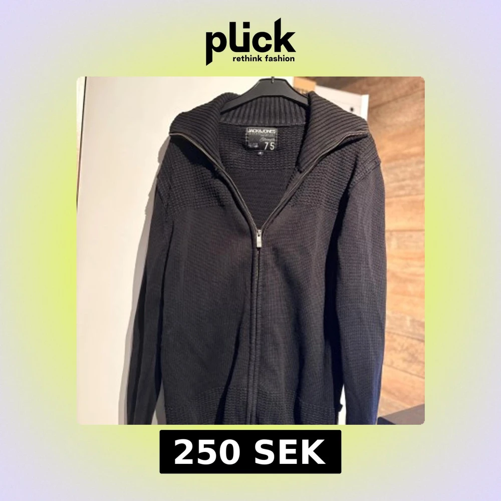 Svart stickad kofta från Jack & Jones med grov ribbad krage och dragkedja framtill. Snygg struktur på axlar och nederkant, långärmad och perfekt för kyliga dagar. Enkel att matcha med jeans eller chinos.