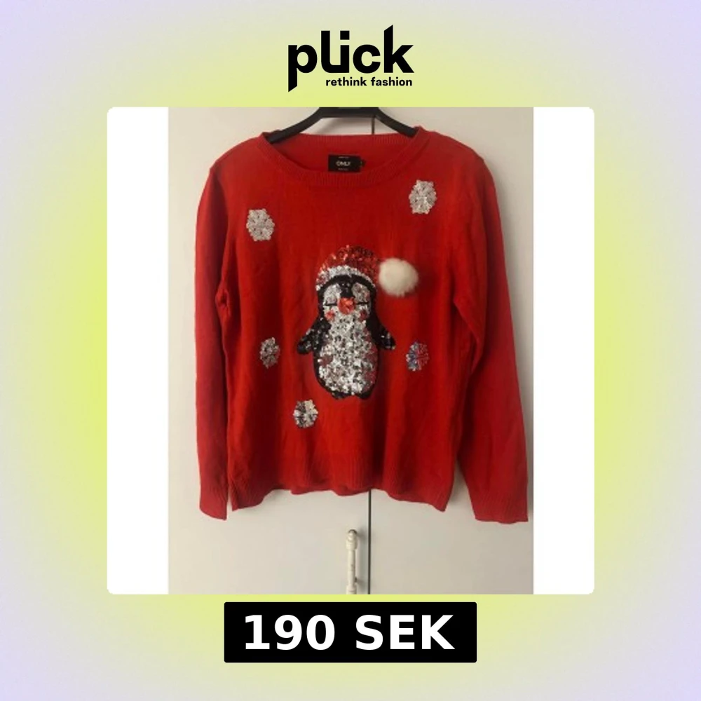 Röd stickad tröja från ONLY med ett gulligt paljettmönster av en pingvin i tomteluva och snöflingor. Tröjan har lång ärm och rund hals. Perfekt för att maxa julstämningen med lite extra glitter och fluffig detalj på luvan. Tröjan är en tunn i tyget. Liten i storleken.