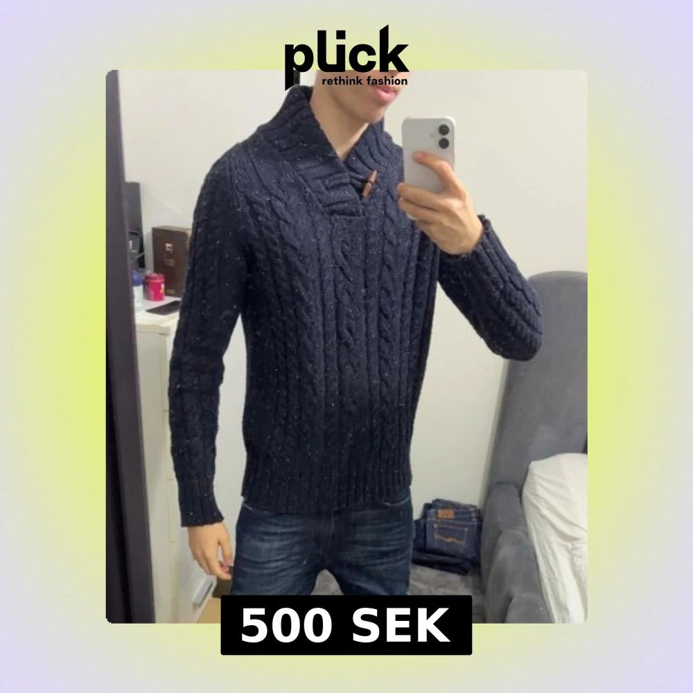 Säljer en mörkblå stickad tröja med grovt kabelmönster och bred krage med snygg knappdetalj. Tröjan har långärmade och ribbade muddar, perfekt för kyliga dagar. Passar dig som gillar klassisk stil med en modern twist.