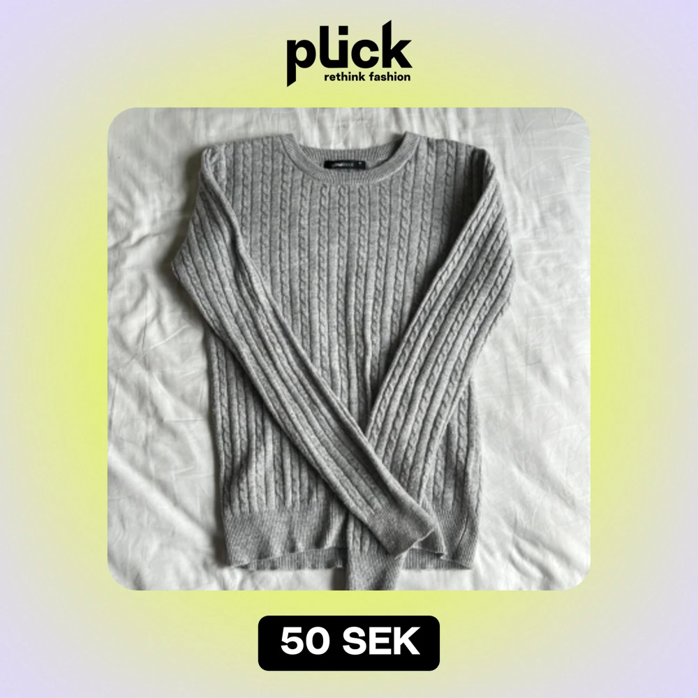 grå kabelstickad tröja som har fin passform(har ett litet hål under armhålen som bilden visar, men går lätt att sy ihop) därav priset🌸