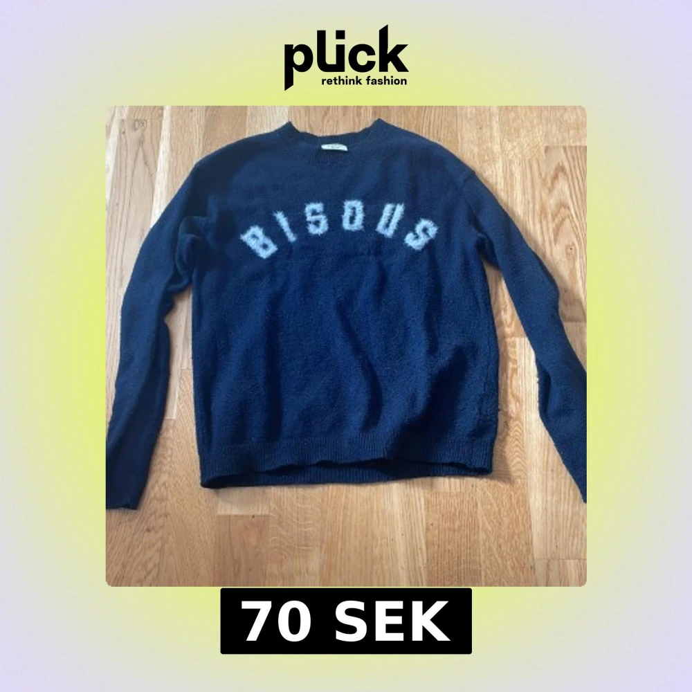 Mysig mörkblå stickad tröja från Kappahl med texten 'BISOUS' i fluffiga vita bokstäver över bröstet. Tröjan har rund halsringning och långa ärmar, perfekt för kyliga dagar.
