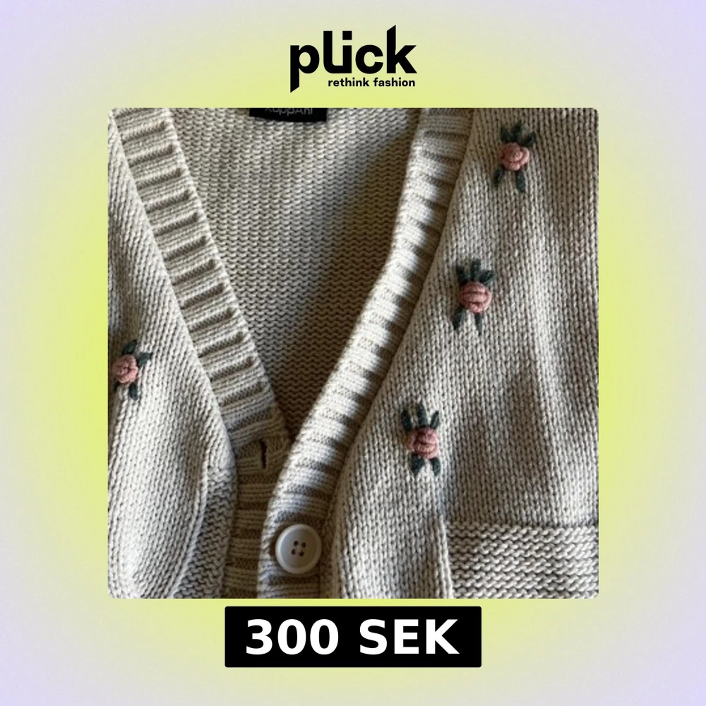 Superfin beige stickad kofta från KappAhl med broderade rosa blommor och gröna blad framtill. Koftan har grovstickade flätor längs knäppningen, två stora knappar och djupa fickor. Perfekt för lager-på-lager och chill höststil.