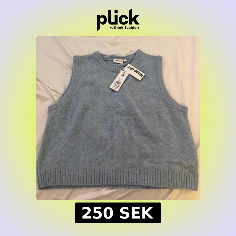 Säljer en ljusblå stickad väst från Kappahl. Aldrig använd. Västen har en ribbad kant vid ärmhålen och nederkanten, vilket ger en snygg och stilren look. Perfekt för lager-på-lager under kyligare dagar.
