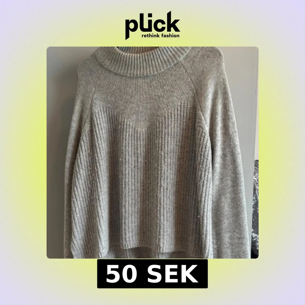 Mysig grå stickad tröja från KappAhl med bred ribbad krage och snyggt strukturerat mönster framtill. Perfekt för kyliga dagar och enkel att styla med jeans eller kjol.