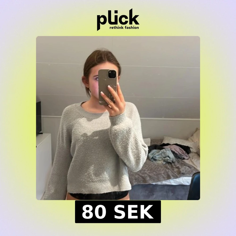 Supermysig ljusgrå stickad tröja från KappAhl med rund halsringning och ribbade muddar. Tröjan har en lite croppad passform och långa ärmar, perfekt för lager på lager under kyliga dagar.