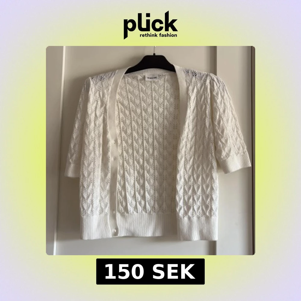 Säljer en söt vit stickad kofta från Kappahl i storlek S. Koftan har korta ärmar, fina knappar framtill och ett snyggt hålmönster som ger en fräsch och trendig look. Perfekt att slänga över en topp när det är lite kyligt ute.