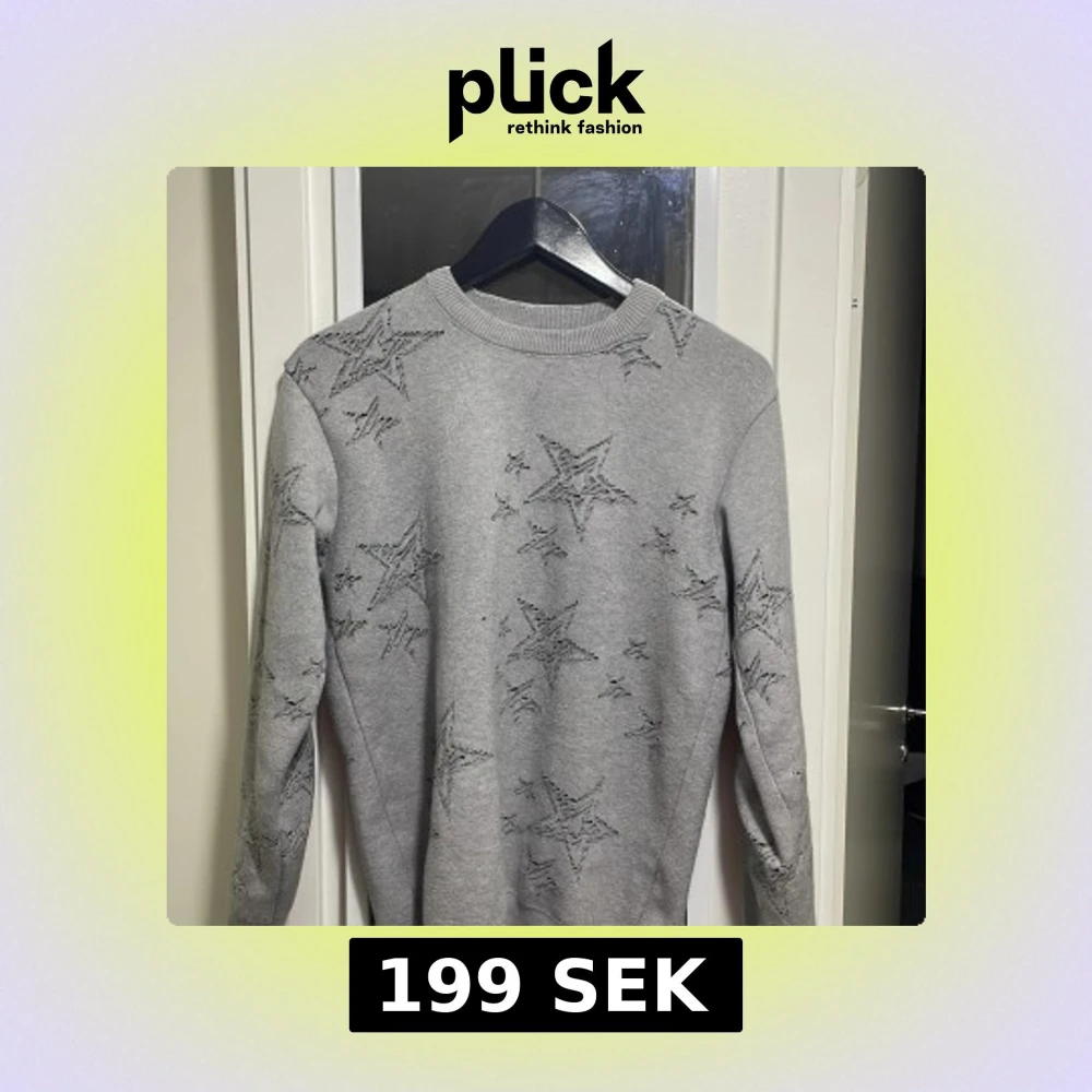 Säljer en grå stickad tröja från Kenzo med broderade stjärnor över hela tröjan. Rund halsringning och långa ärmar. Perfekt för dig som vill ha något unikt och snyggt i garderoben.