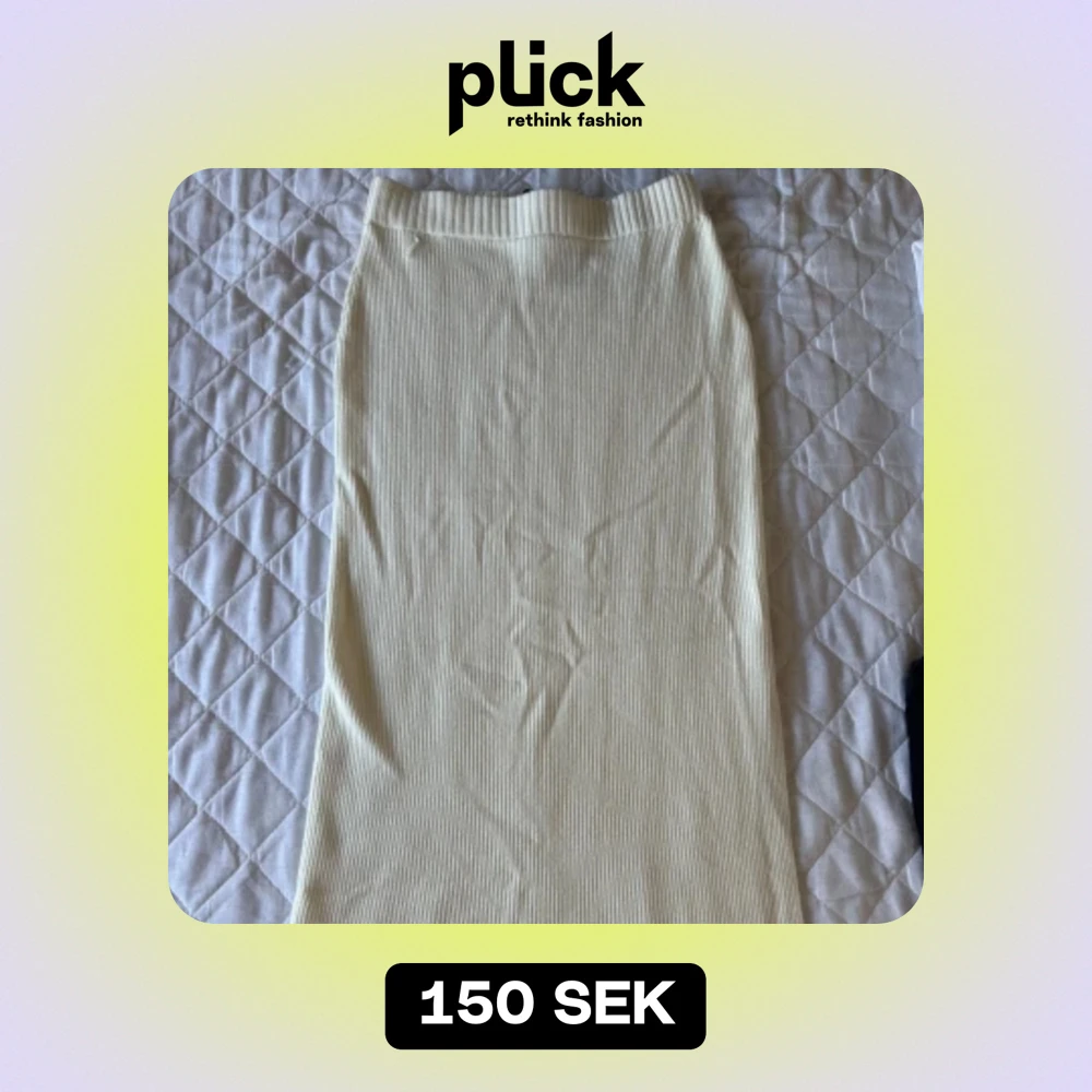 Vit stickad ribbad kjol väldigt stretchigt material, den är i storlek Xs men jag som har storlek M får på mig den och den har även en slits på sidan av benet.