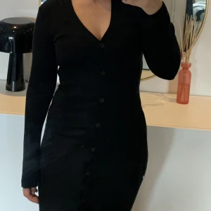 Stickad klänning med knappar på hela framsidan. Ska egentligen finnas ett band som jag tagit bort. Lite nopprigt på ena sidan, går säkert att få bort mer rakhyvel eller noppmaskin. Drf säljes billigt.