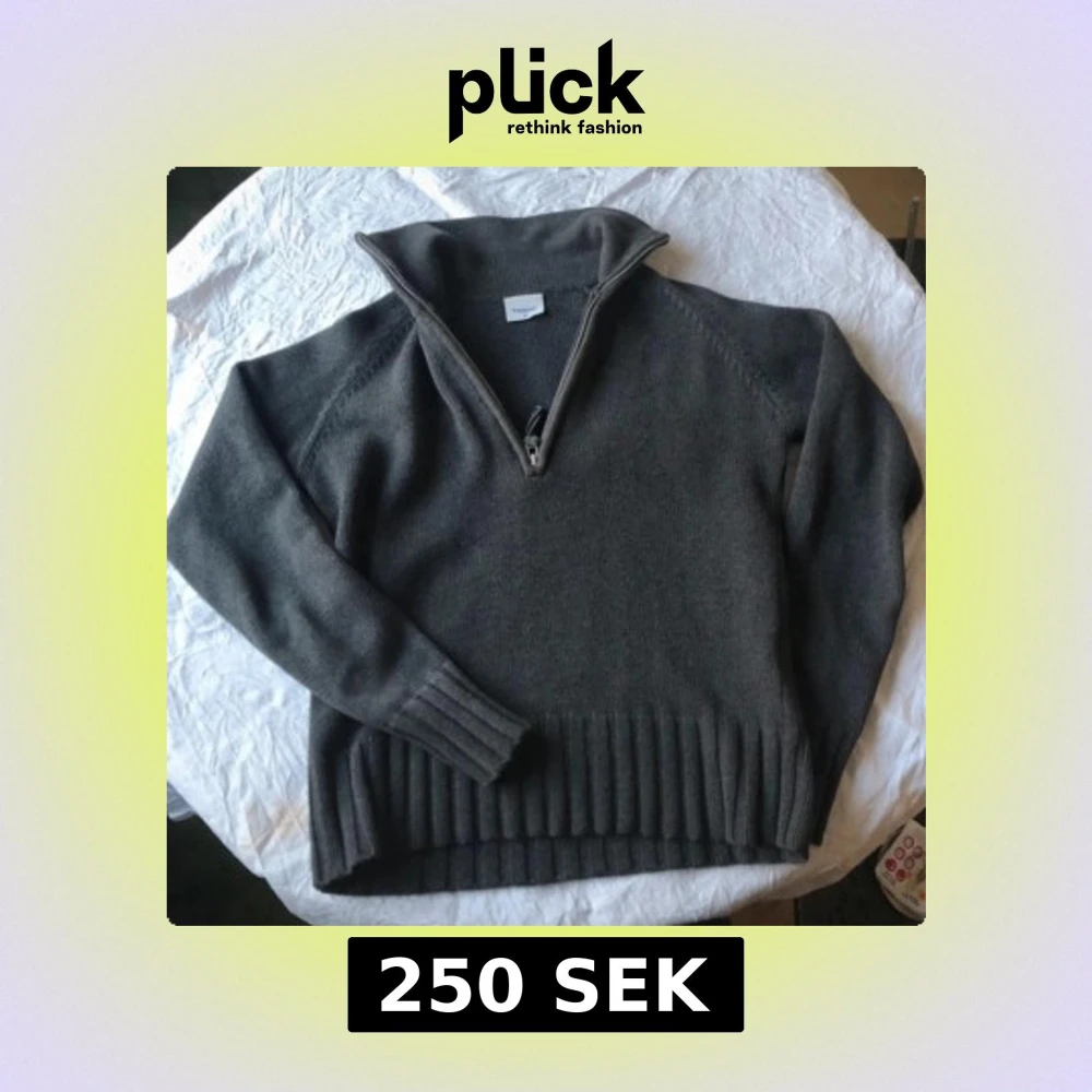 Säljer en grå stickad tröja från BOOMERANG med dragkedja vid halsen. Tröjan har långa ärmar och ribbstickade muddar vid ärmslut och nederkant.