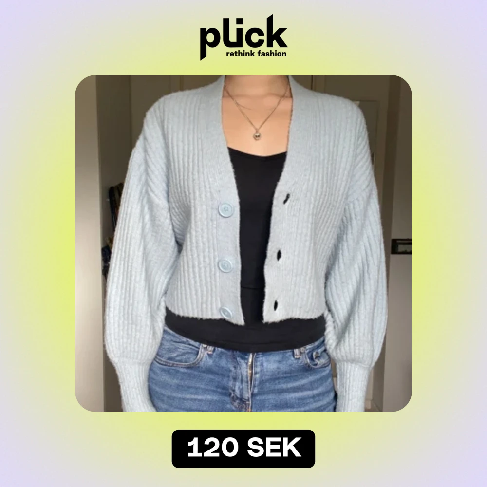 Supermjuk babyblå stickad kofta med vida ballongärmar. Har klippt av lappen men om jag minns rätt köpte jag den på hm! Bra skick, behöver kanske lite noppborttagning men annars fin!