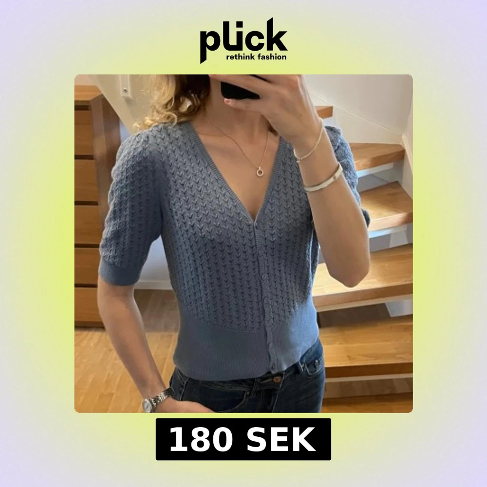Supersöt ljusblå stickad kofta från KappAhl med korta ärmar och v-ringning. Koftan har ett snyggt strukturmönster, ribbade muddar och knappar framtill. Perfekt att slänga över ett linne eller t-shirt.🩵