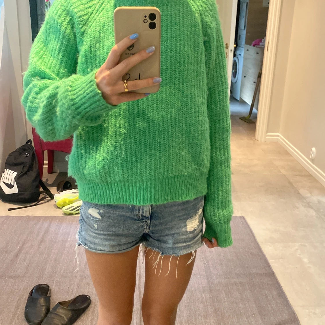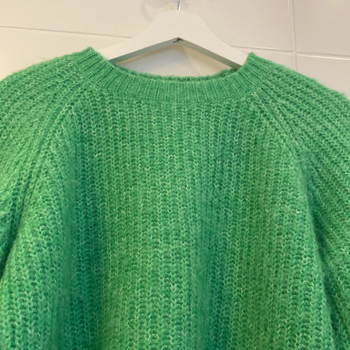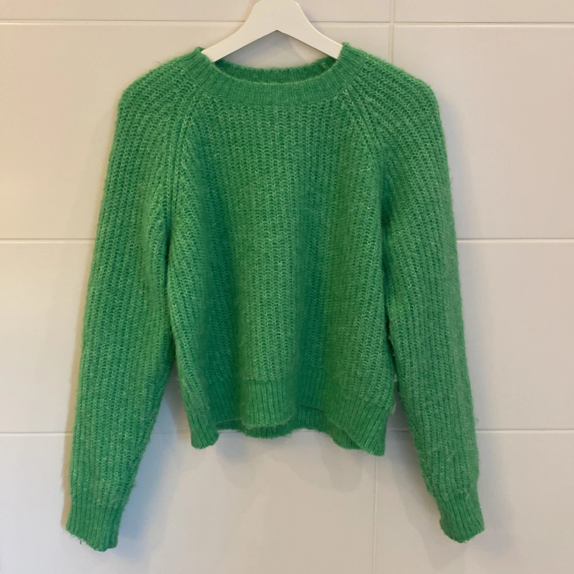 Grön typ stickad kofta jätte fin och skön har används några gånger, säljer den för att jag inte använder den längre (Hon som bär koftan är 163-164 ish)👌🏼❤️