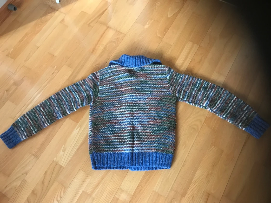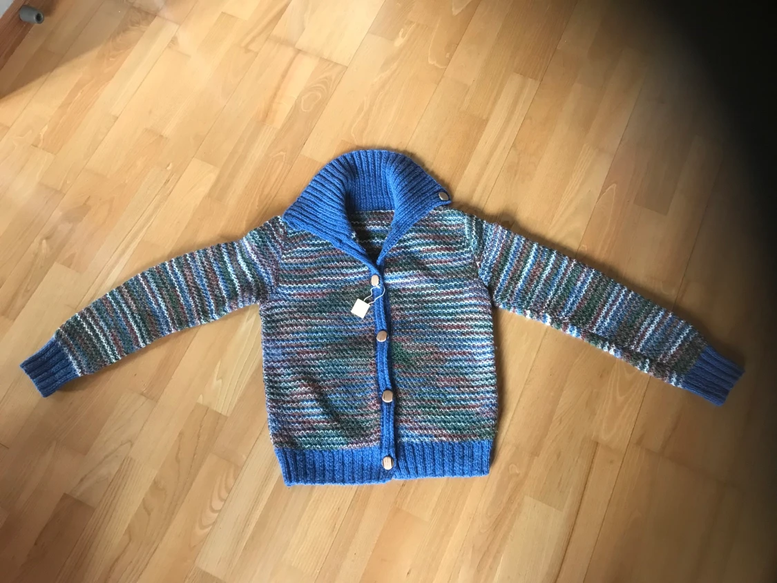 Flerfärgad retro handstickad kofta med blå muddar och krage, trä knappar. Storlek uppskattas som en S.