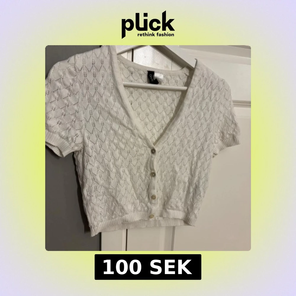 Supersöt vit stickad blus från DIVIDED i storlek S. Den har korta ärmar, v-ringning och knappar framtill. Mönstret är diskret och ger en fräsch känsla, perfekt för vår och sommar. Ribbad kant vid ärmslut och nederkant för extra stilpoäng.