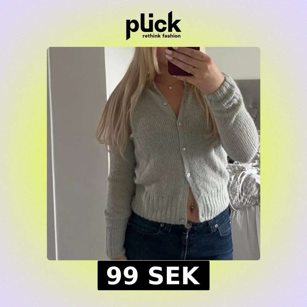 Supermysig ljusgrå stickad kofta med v-ringning och knappar framtill.