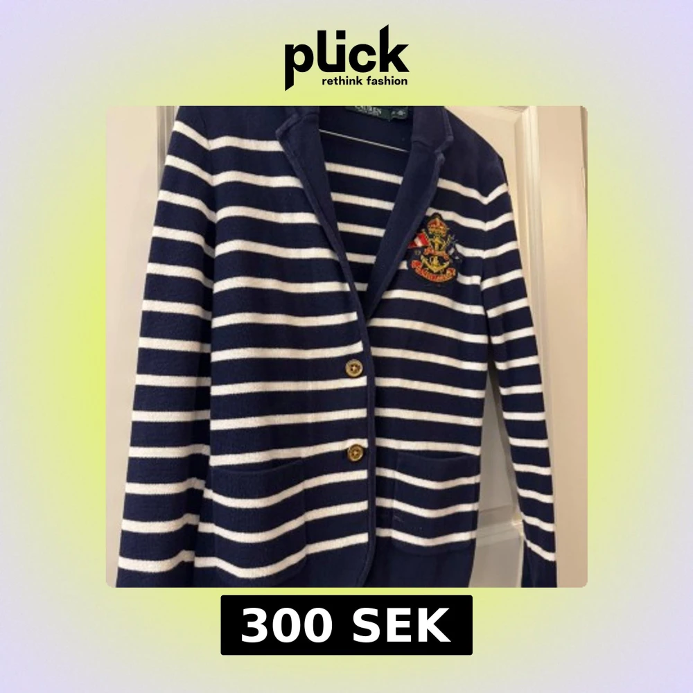 Snygg stickad cardigan jacka från Ralph Lauren i marinblått och vitt med horisontella ränder. Jackan har två guldknappar, fickor framtill och en broderad patch på bröstet. Klassisk krage och långärmad modell, perfekt för en preppy look.