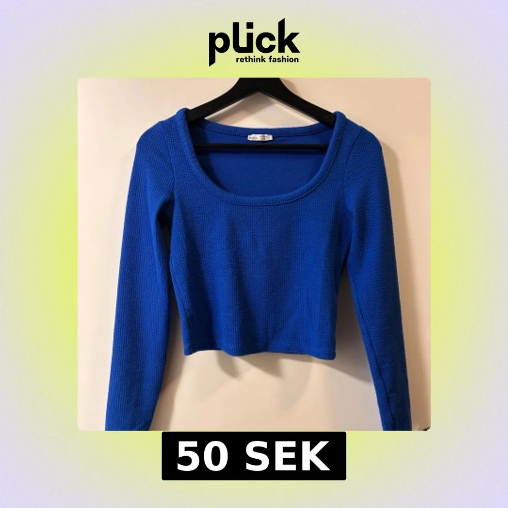 Snygg kornblå croppad topp från Bershka med lång ärm och rund, djup ringning. Stickad struktur som ger en cool känsla och passar perfekt till jeans eller kjol. Enkel men ändå trendig design som lyfter din outfit.