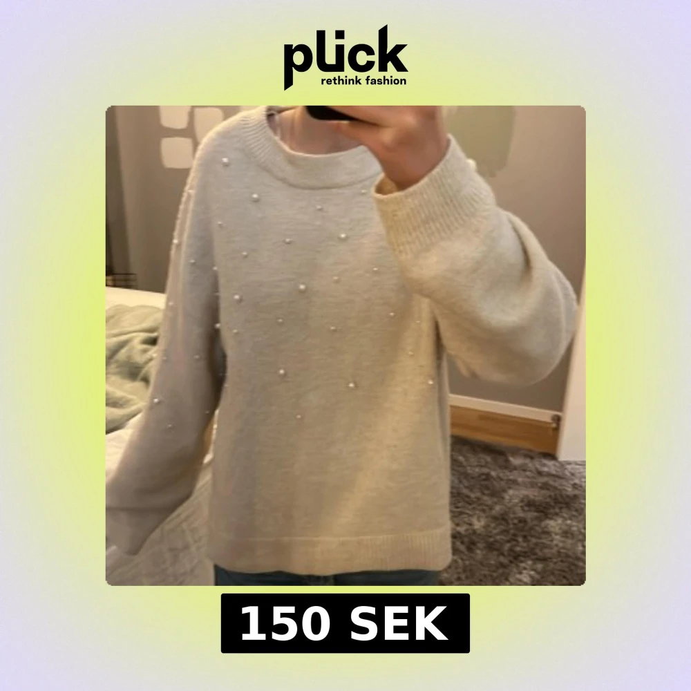 Säljer en kräm-vit stickad tröja från H&M med dekorativa pärlor framtill. Tröjan har rund halsringning, långa ärmar och ribbade muddar vid ärmslut och nederkant. Perfekt för en mysig och stilren look!