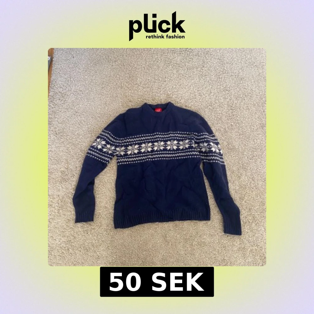 Säljer en snygg mörkblå stickad tröja med ett klassiskt vitt mönster över bröstet och ärmarna. Tröjan har långa ärmar och ribbstickade muddar vid ärmslut och nederkant. Perfekt för kyliga dagar!