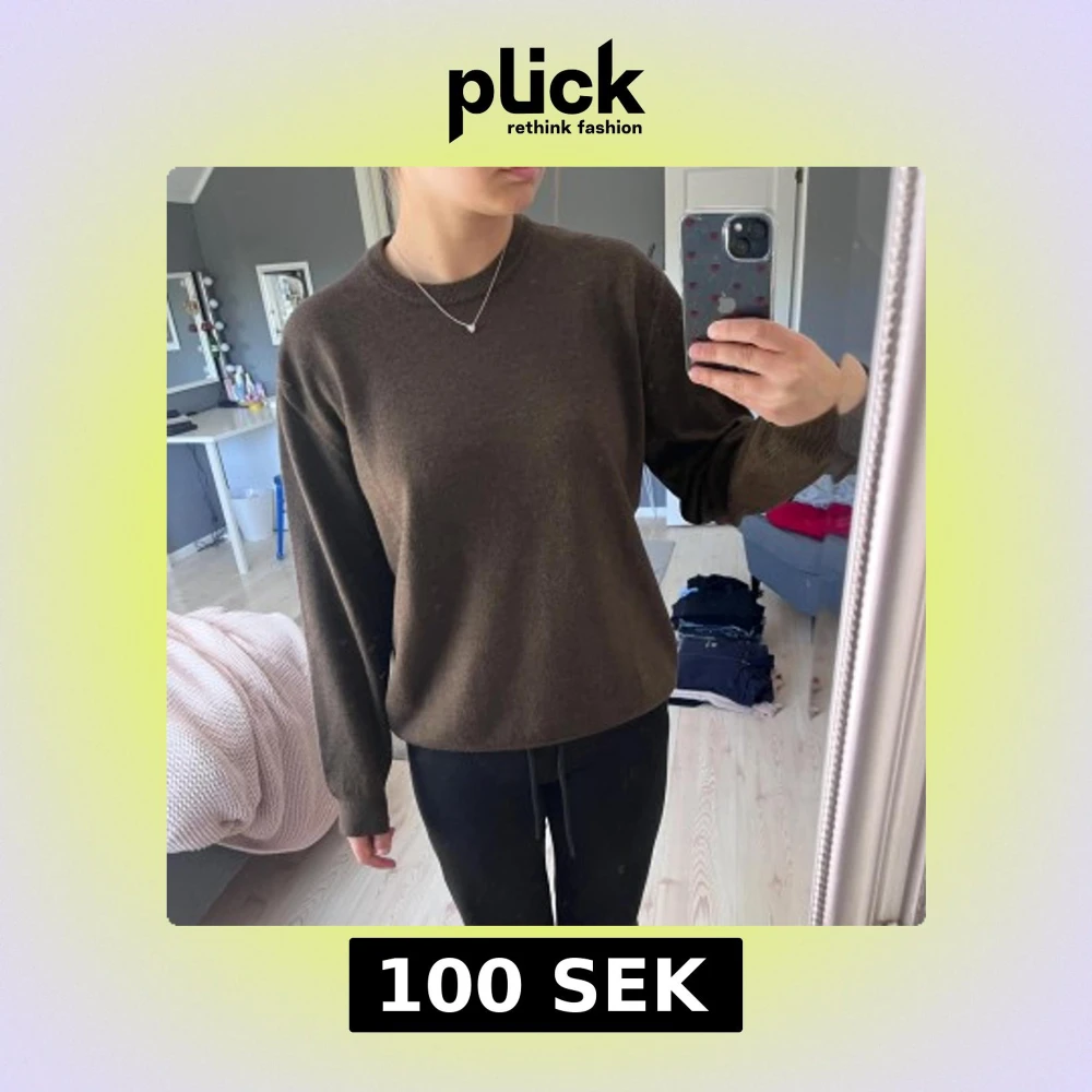 Mysig brun stickad tröja med rund halsringning och långa ärmar. Superskön och passar till det mesta. Inga defekter förutom lite rosa färg på ena ärmen😙