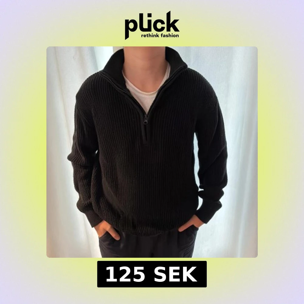 Svart stickad tröja från Grunt i juniorstorlek L. Som referens så är personen på bilden 158 cm lång. Tröjan har en ribbad struktur och en hög krage med half zip-dragkedja framtill. Långärmad och loose passform, perfekt för att hålla sig varm och ändå se chill ut.