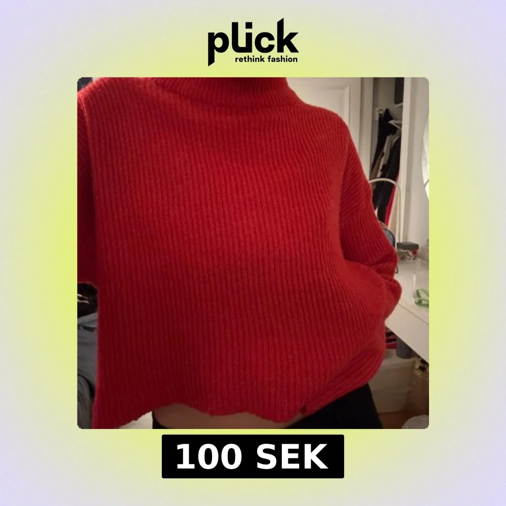Snygg röd ribbad tröja med croppad passform. Tröjan har långa ärmar och en hög krage, perfekt för, från HM, bra skick! Storlek L men mer som en S.