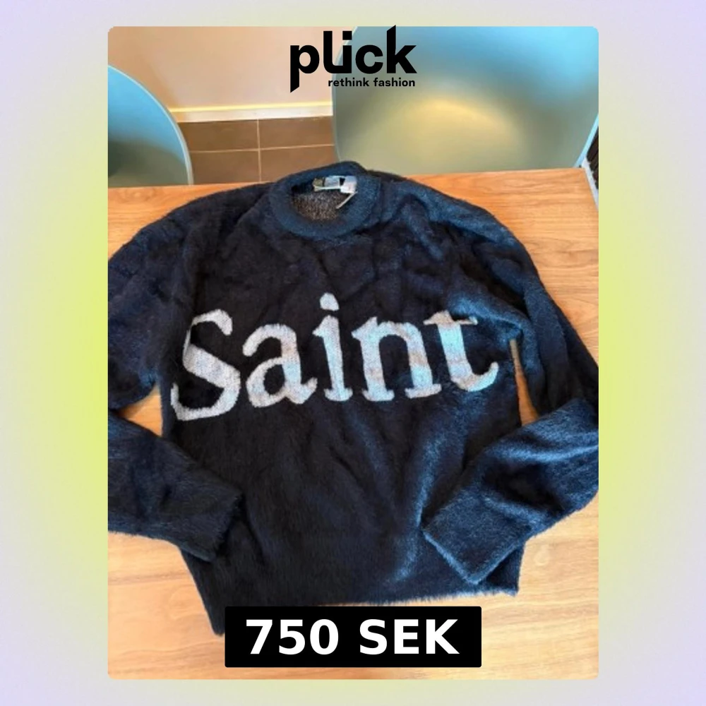 Säljer en svart, supermjuk och fluffig stickad tröja från Saintmex Life Style. Tröjan har rund hals, långa ärmar och stor vit text 'Saint' framtill. Perfekt för dig som vill ha en statement piece med skön känsla.