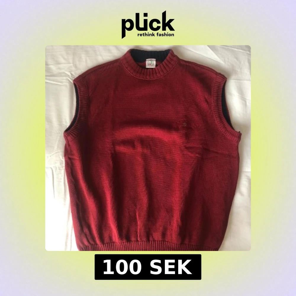 Snygg vinröd stickad väst från Boomerang Sportswear med broderad logga på bröstet. Ribbade kanter vid hals, ärmhål och nederkant. Perfekt att slänga över en skjorta eller tshirt. Storlek L.