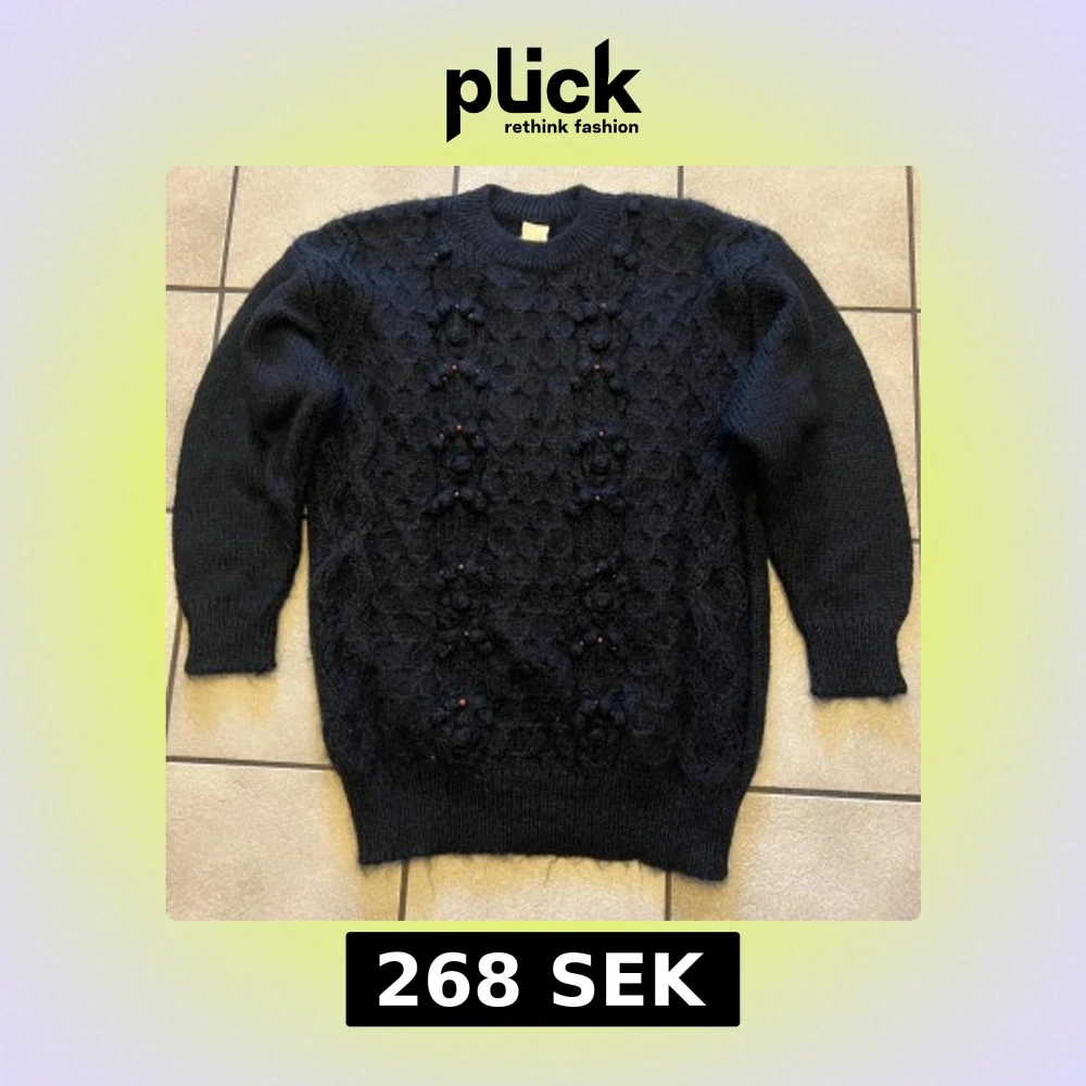 Mysig svart stickad tröja med unikt strukturmönster och små bruna pärlor framtill. Tröjan har rund halsringning, långa ärmar och breda ribbade muddar vid ärmslut och nederkant. Perfekt för kalla dagar när du vill ha något både snyggt och bekvämt.
