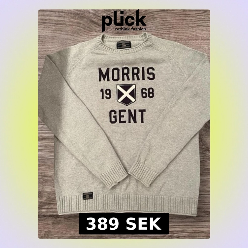 Snygg ljusgrå stickad tröja från Morris Gents med broderad text och emblem på bröstet. Tröjan har rund hals, ribbade muddar och lång ärm. Perfekt för dig som gillar klassisk stil med en modern touch.