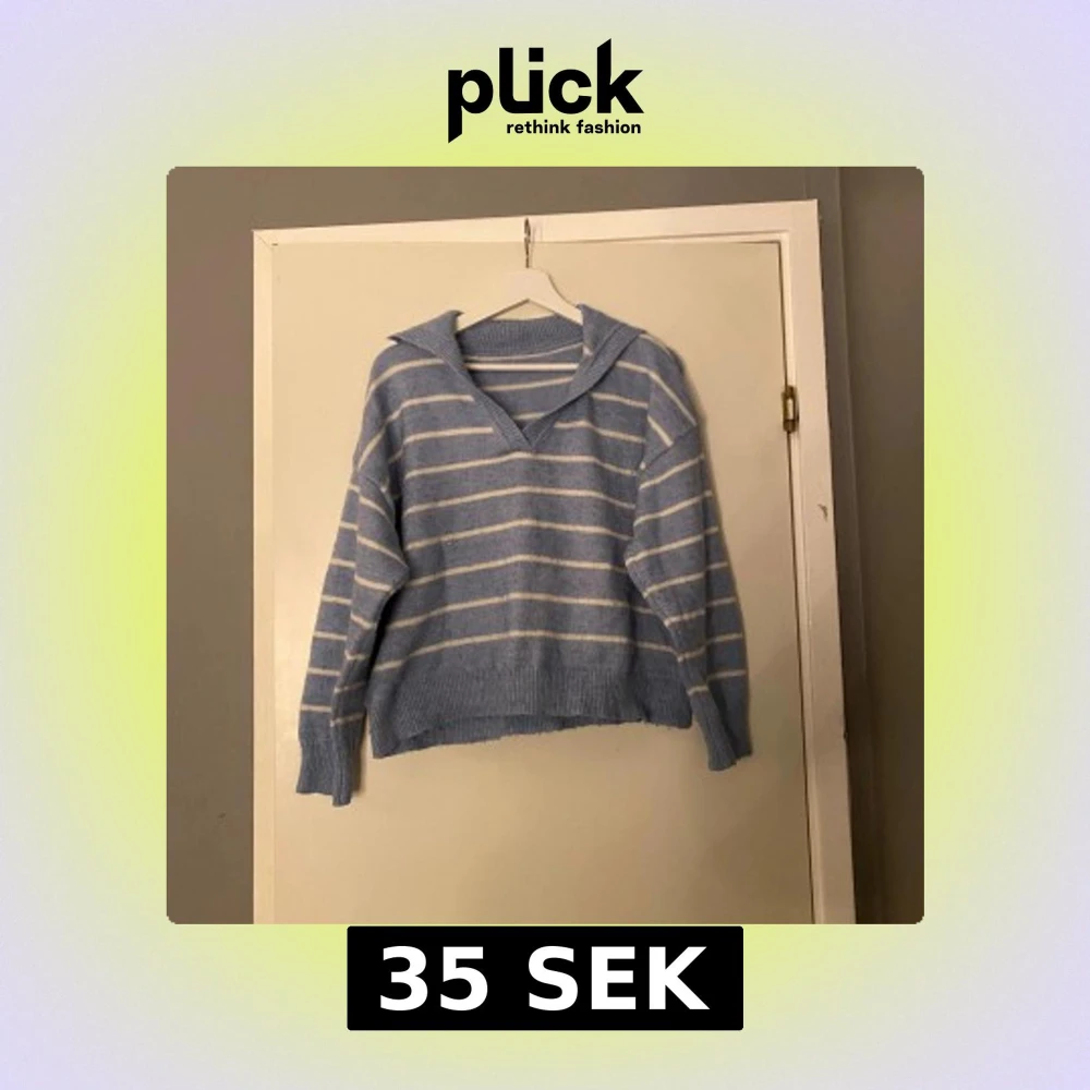 Mysig stickad tröja i ljusblått med vita ränder och bred krage. Tröjan har v-ringning, ribbade muddar och en loose passform. Perfekt för lager-på-lager och chill dagar. Snygg till jeans eller kjol.Passar perfekt nu till hösten 💙