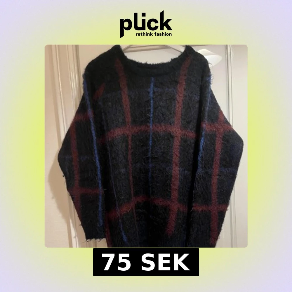 Säljer en oversized stickad tröja med rutig design i svart, vinrött och blått. Tröjan har en fluffig, grovstickad känsla och rund hals. Perfekt för dig som gillar en chill och mysig vibe med lite edge.