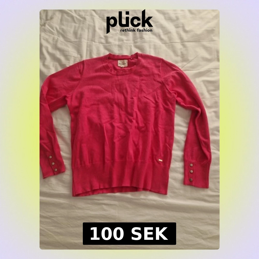 Snygg rosa stickad tröja från Holly & Whyte i storlek L. Tröjan har rund hals, långa ärmar med tre dekorativa knappar vid ärmsluten och en liten metallbricka vid nederkanten. Perfekt för dig som gillar färg och stilrena detaljer. Liten i storlek
