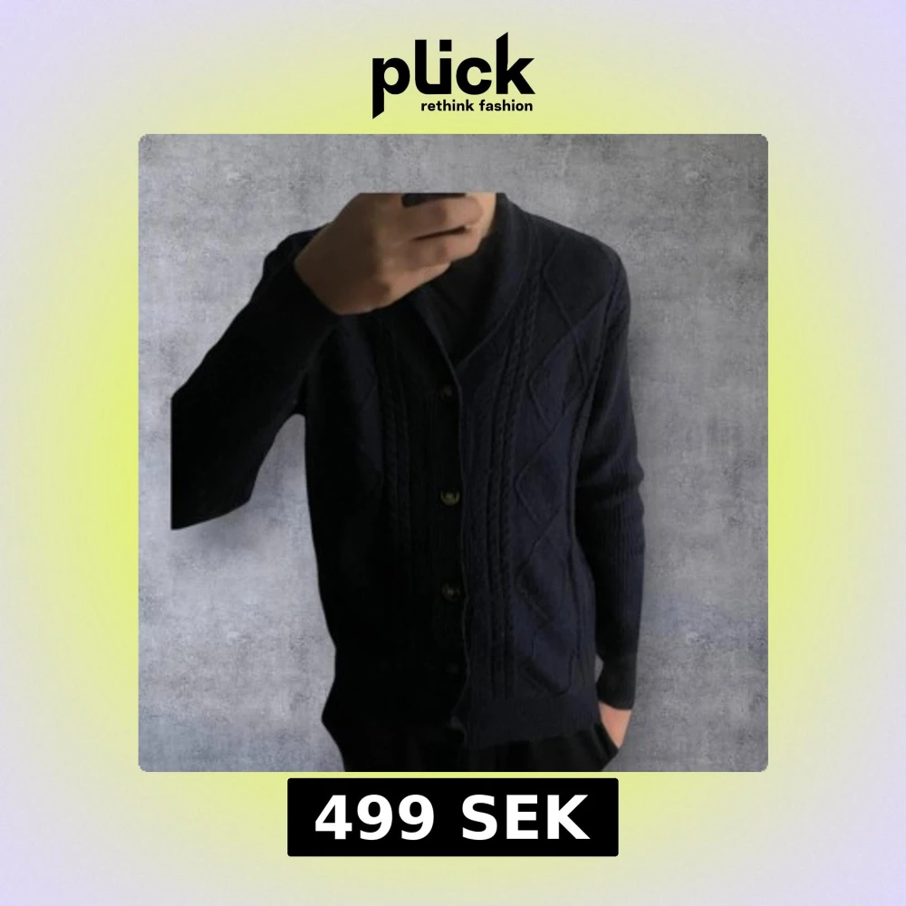 Snygg mörkblå kofta från Baker's i storlek L. Koftan har ett stickat mönster med diskreta diamantformer, knappar framtill och ribbade muddar. Perfekt för dig som gillar klassisk stil med lite extra detaljer.