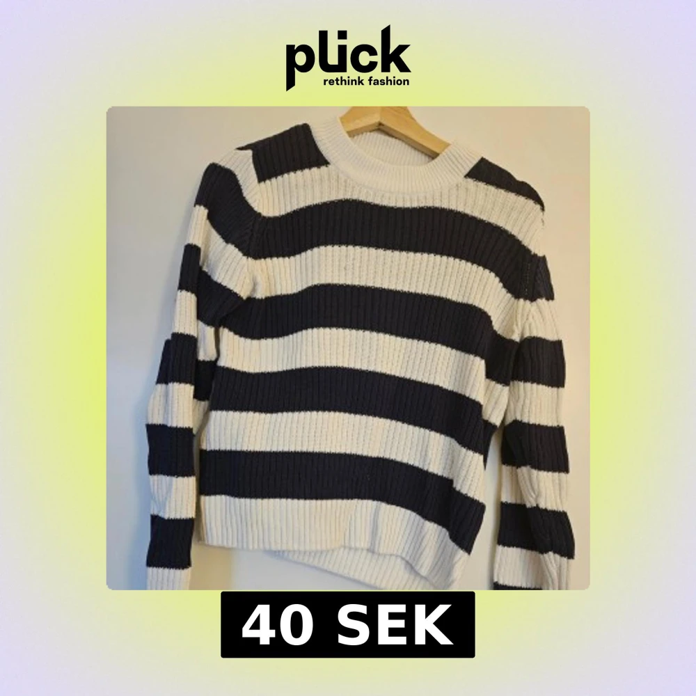 Säljer en snygg randig stickad tröja från 157 i svart och vitt. Tröjan har en ribbad struktur och långa ärmar, perfekt för kyligare dagar. Den har en klassisk rund halsringning och är både stilren och bekväm.