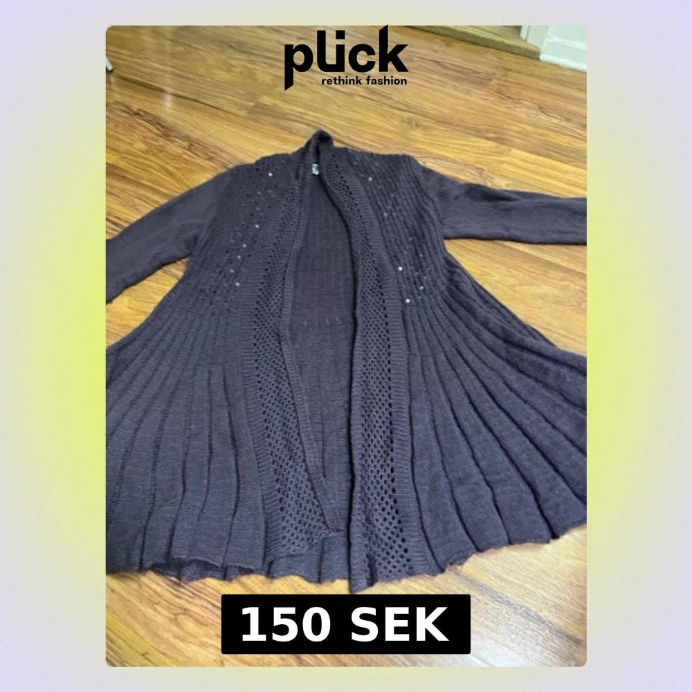 Säljer en mörklila stickad kofta från Isolde i storlek L. Koftan har långärmade armar, öppet framstycke med breda virkade kanter och snygga paljettdetaljer på axlar och bröst. Plisserad nederdel ger extra schysst fall och cool look.